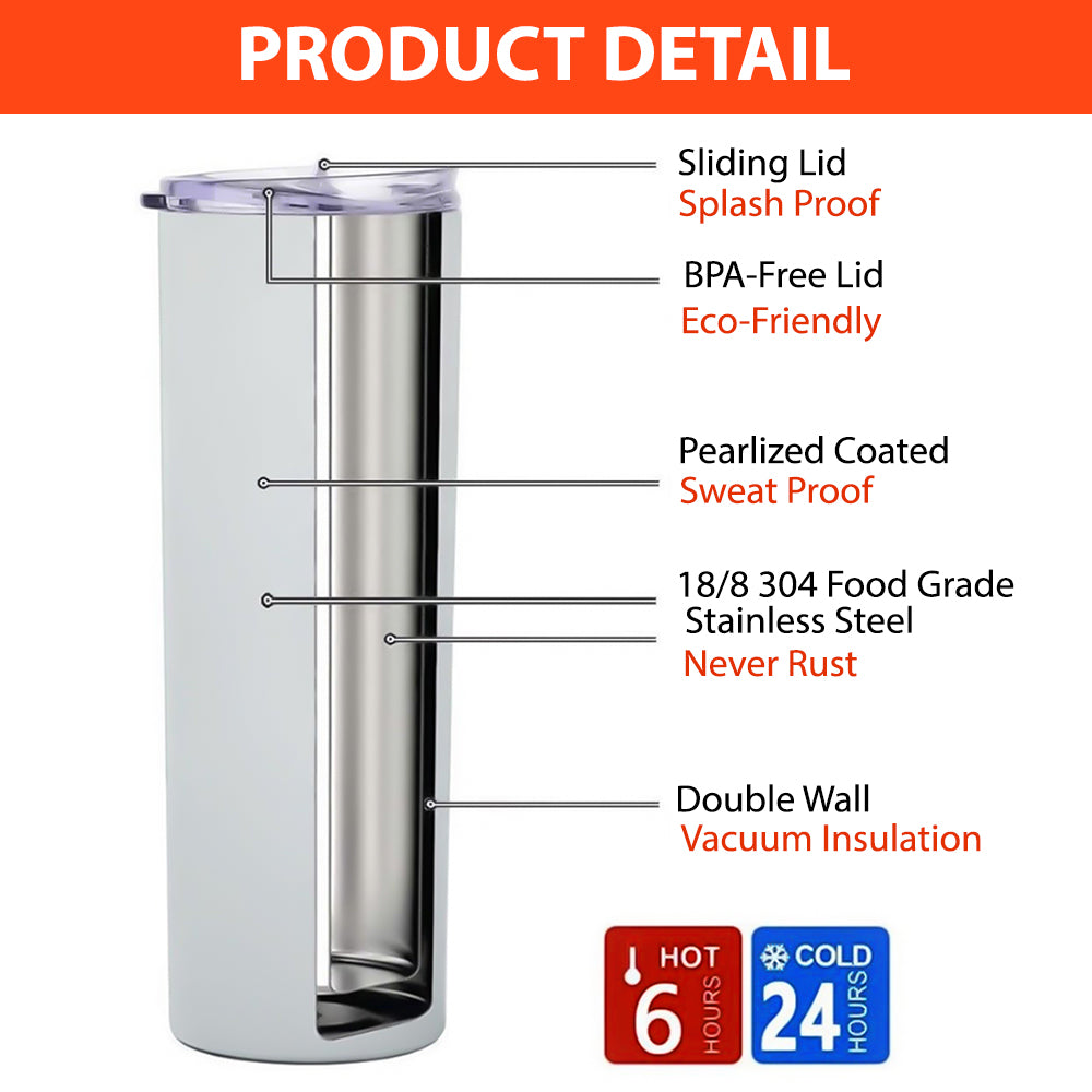 - Customization: We make skinny tumbler on demand, so give us your design to create your one-of-a-kind skinny tumbler. Creative 3D print will make your skinny tumbler more gorgeous and vivid that touch your personality. The design is printed with new age printing technology, direct to the product. It is printed with a water-soluble and eco – friendly ink. It is cured with a heat treatment process to ensure the color-fastness and lasting durability of the design. The color will not fade, it will stay nice and vibrant for years to come!
